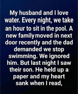 It was a typical night. The air felt warm but not sticky. The pool lights cast a soft glow onto the water, turning it a gentle shade of blue. My husband and I were standing near the edge, towels wrapped around our shoulders, talking quietly.