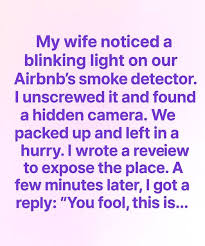 My wife noticed a blinking light on our Airbnb’s smoke detector. I climbed up, unscrewed the cover, and froze. Inside was a tiny lens — a hidden…