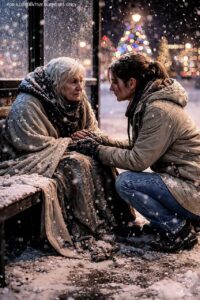 She was sitting at a bus stop bench, her body curled inward as if trying to disappear into the night. Thin blankets were wrapped around her shoulders, offering little protection against the cold. Snow had gathered in her hair and along the folds of her coat. Her hands shook as she tried to warm them with her breath.