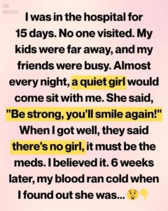 When I finally regained my voice, one of the first things I asked a nurse about was the girl. The nurse listened kindly, then gently shook her head. No one matching that description had been recorded as a visitor. There were no notes, no sign that anyone had been coming to sit with me at night.