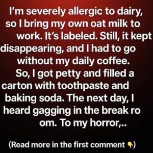 I’m severely allergic to dairy, so I bring labeled oat milk to work—but it kept disappearing. Frustrated, I filled a carton with toothpaste. The next day, I…